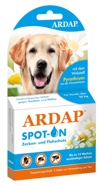 Das ARDAP Spot-On mit dem Wirkstoff Pyrethrum aus der Chrysantheme ist ein hochwirksames Mittel zur äußerlichen Anwendung bei Hunden. Durch die repellierende, abwehrende Wirkung bietet das ARDAP Spot-On einen zuverlässigen und langanhaltenden Schutz vor Zecken und Flöhen. Die einmalige Gabe einer ARDAP Spot-On Tube schützt Ihr Haustier bis zu 4 Wochen zuverlässig. Die Behandlung kann wiederholt werden, falls der zuvor behandelte Hund mehrfach in heftigen Regen oder ins Wasser geraten ist.