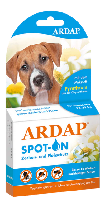 Das ARDAP Spot-On mit dem Wirkstoff Pyrethrum aus der Chrysantheme ist ein hochwirksames Mittel zur äußerlichen Anwendung bei Hunden. Durch die repellierende, abwehrende Wirkung bietet das ARDAP Spot-On einen zuverlässigen und langanhaltenden Schutz vor Zecken und Flöhen. Die einmalige Gabe einer ARDAP Spot-On Tube schützt Ihr Haustier bis zu 4 Wochen zuverlässig. Die Behandlung kann wiederholt werden, falls der zuvor behandelte Hund mehrfach in heftigen Regen oder ins Wasser geraten ist.