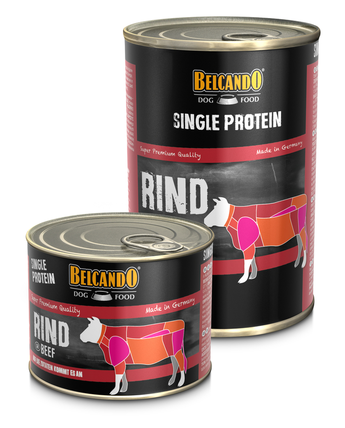 Unsere neue Dosennahrung Belcando® Single Protein gibt es in vier ausgesuchten Fleischsorten. Es sind keine weiteren Zusätze enthalten. Single Protein Feuchtnahrung ist in Kombination mit dem Ergänzungsfuttermittel