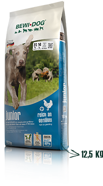 BEWI DOG® junior ist das ausgewogene Futter für Junghunde größerer Rassen wie Schäferhund, Retriever, Labrador, Weimaraner, Hovawart oder Rottweiler. Es enthält wertvolle Zusatzstoffe, die Mineralstoffversorgung ist dem Wachstum angepasst.