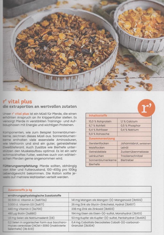 Unser r’ vital plus ist ein Müsli für Pferde, die einen erhöhten Anspruch an ihr Krippenfutter stellen. Es versorgt Pferde in verstärkten Trainings- und Aufbauphasen mit Energie und wichtigen Proteinen.